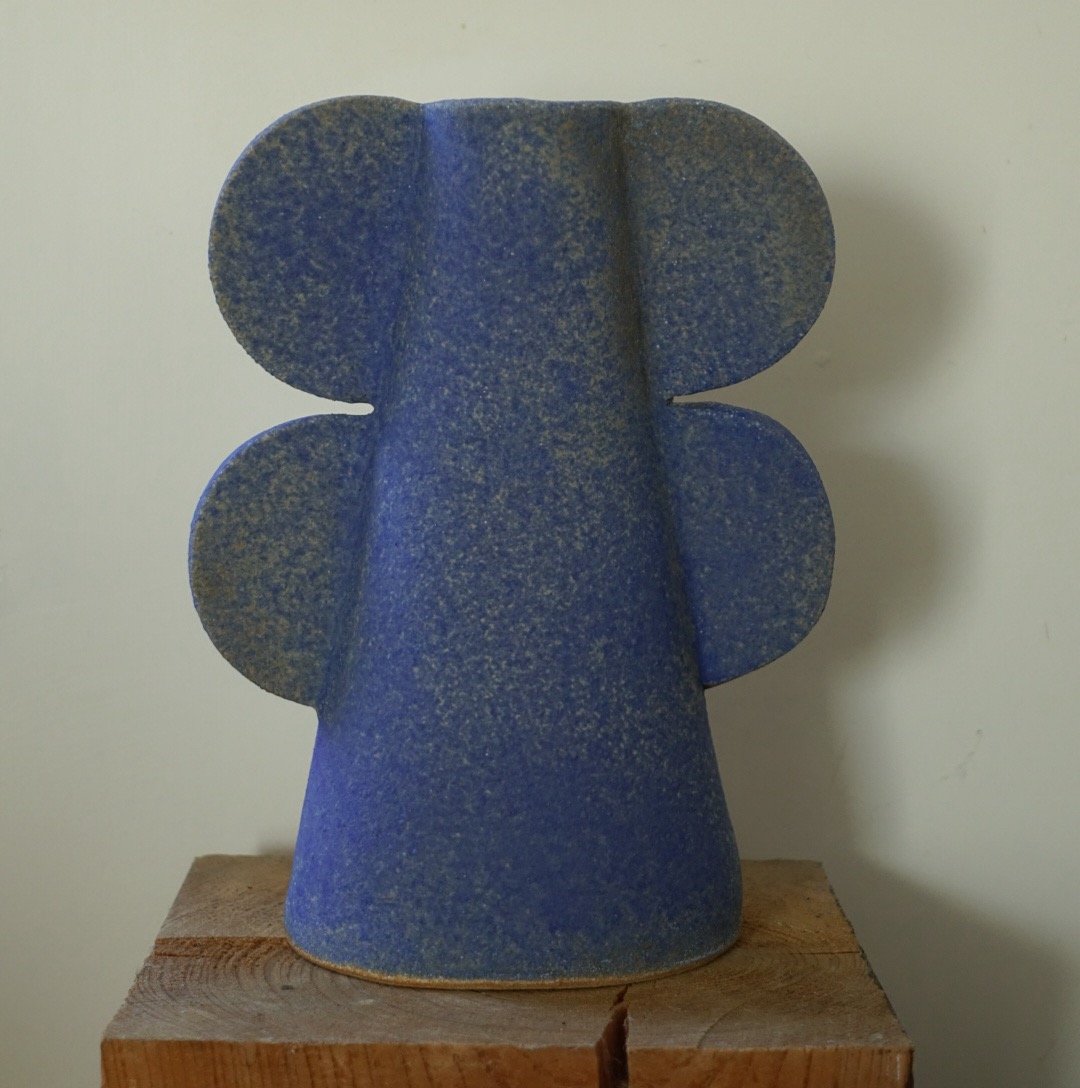 Hand built vase with sprayed matte glaze creating glazed and unglazed areas in matte blue and buff clay colours.