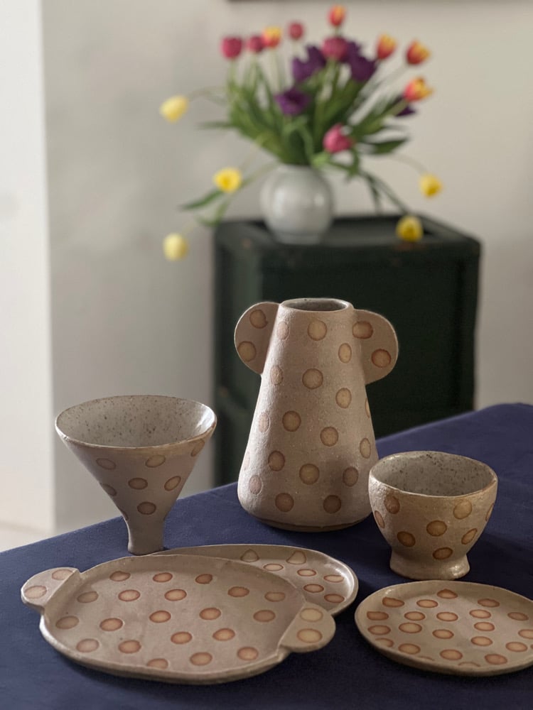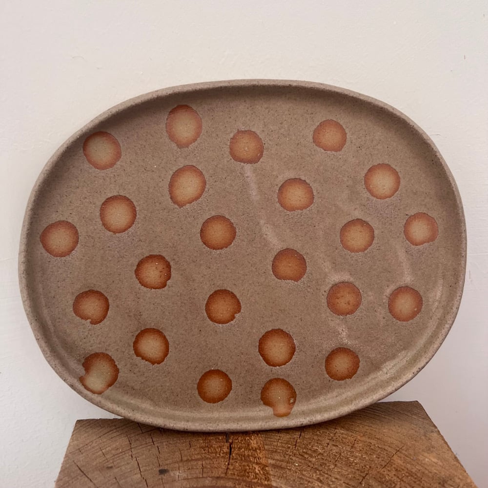 Hand built plate/platter with spotty resist pattern on a textured clay, the sides are pinched up.