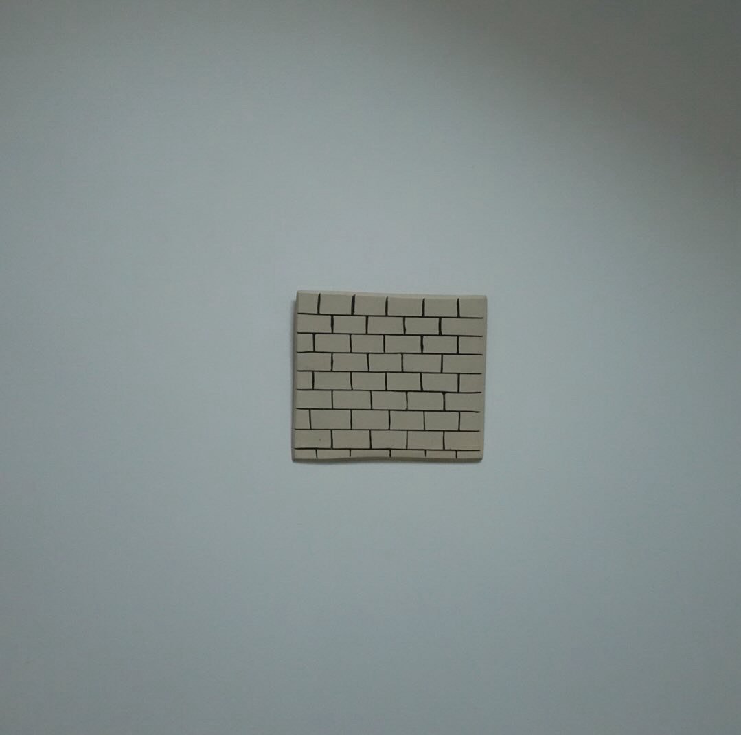Inlaid ceramic flat wall piece with dark inlay and faceted and wobbly edges.